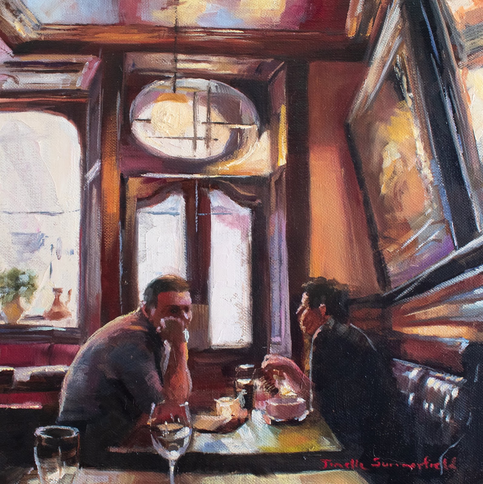 This couple enjoys a cozy dinner on a chilly evening. Oil on 12"h x 9"w x 1 1/2" stretched linen. SOLD.